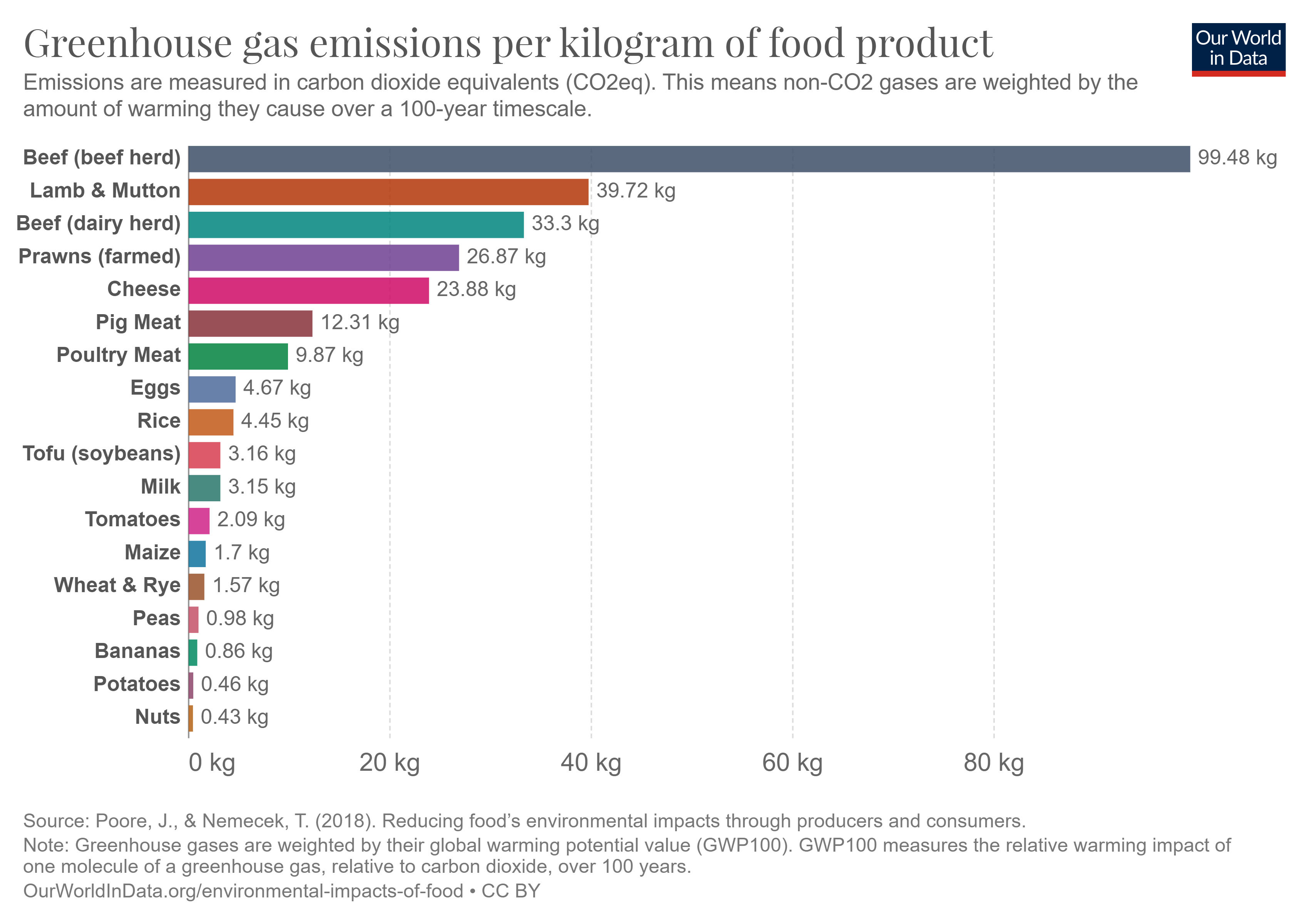Veel Nederlanders geven aan minder vlees te eten of vinden dat ze het zouden moeten doen, laat o.a. onderzoek van het CBS uit 2020 zien. Toch eten we nog z’n 104 gram vlees per dag. We zijn dan ook nog verwijderd van wat een duurzaam dieet voorschrijft, namelijk maximaal 14 gram rood vlees en 29 gram ‘wit’ vlees per dag. Gelukkig geven we wel aan minder vlees te willen eten, dat geeft hoop om de benodigde gedragsveranderingen ook te laten plaatsvinden. Wist je dat een vegetarisch of veganistisch dieet voor 45% tot 55% minder uitstoot van broeikasgassen zorgt?